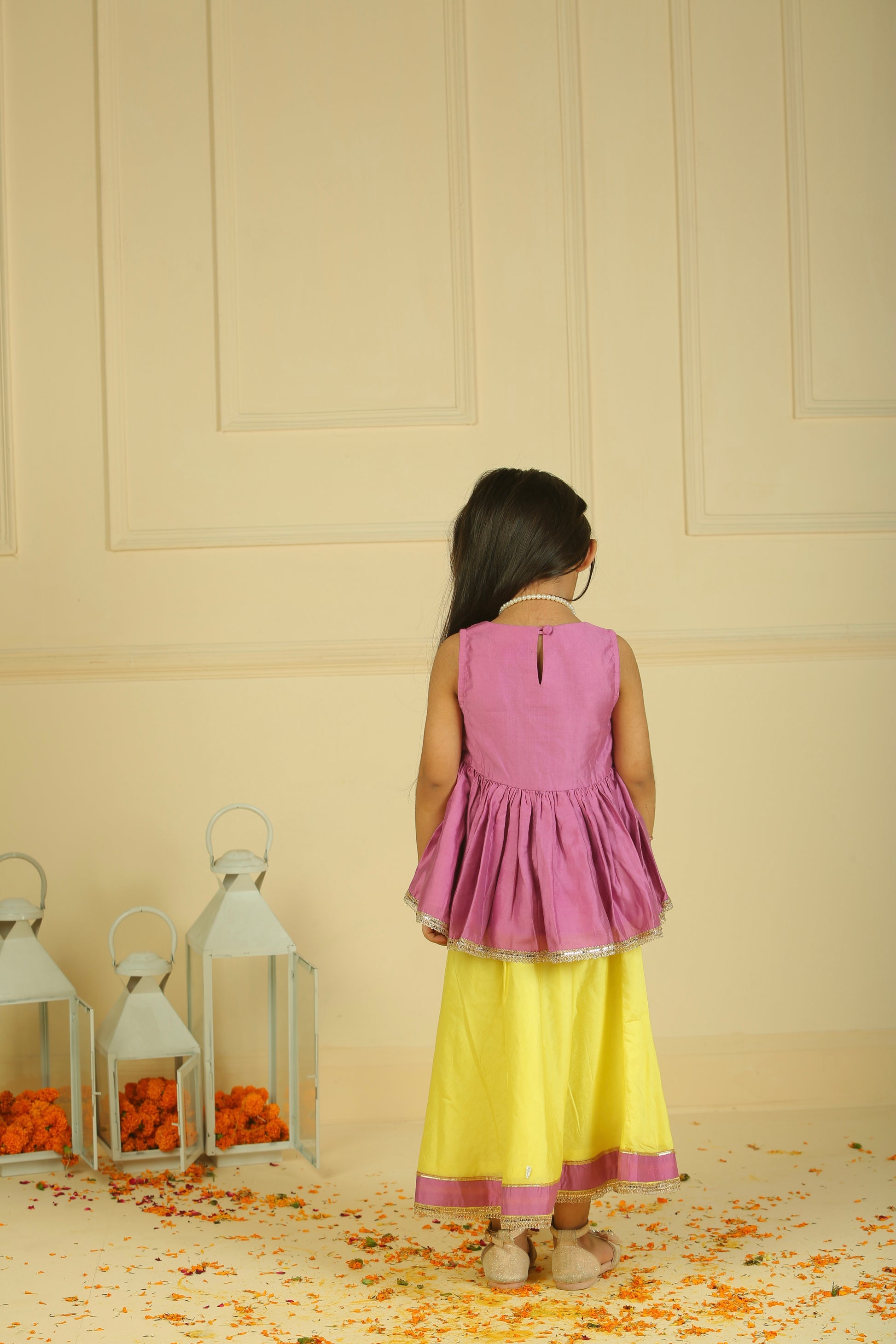This vibrant ensemble combines a sleeveless purple peplum top, enhanced with playful yellow tassels and delicate silver lace, with a striking yellow lehenga featuring a coordinating purple border and tassel tie-ups. Designed for festive occasions, it offers a lively yet elegant look, balancing intricate detailing with comfort and style for memorable celebrations.
