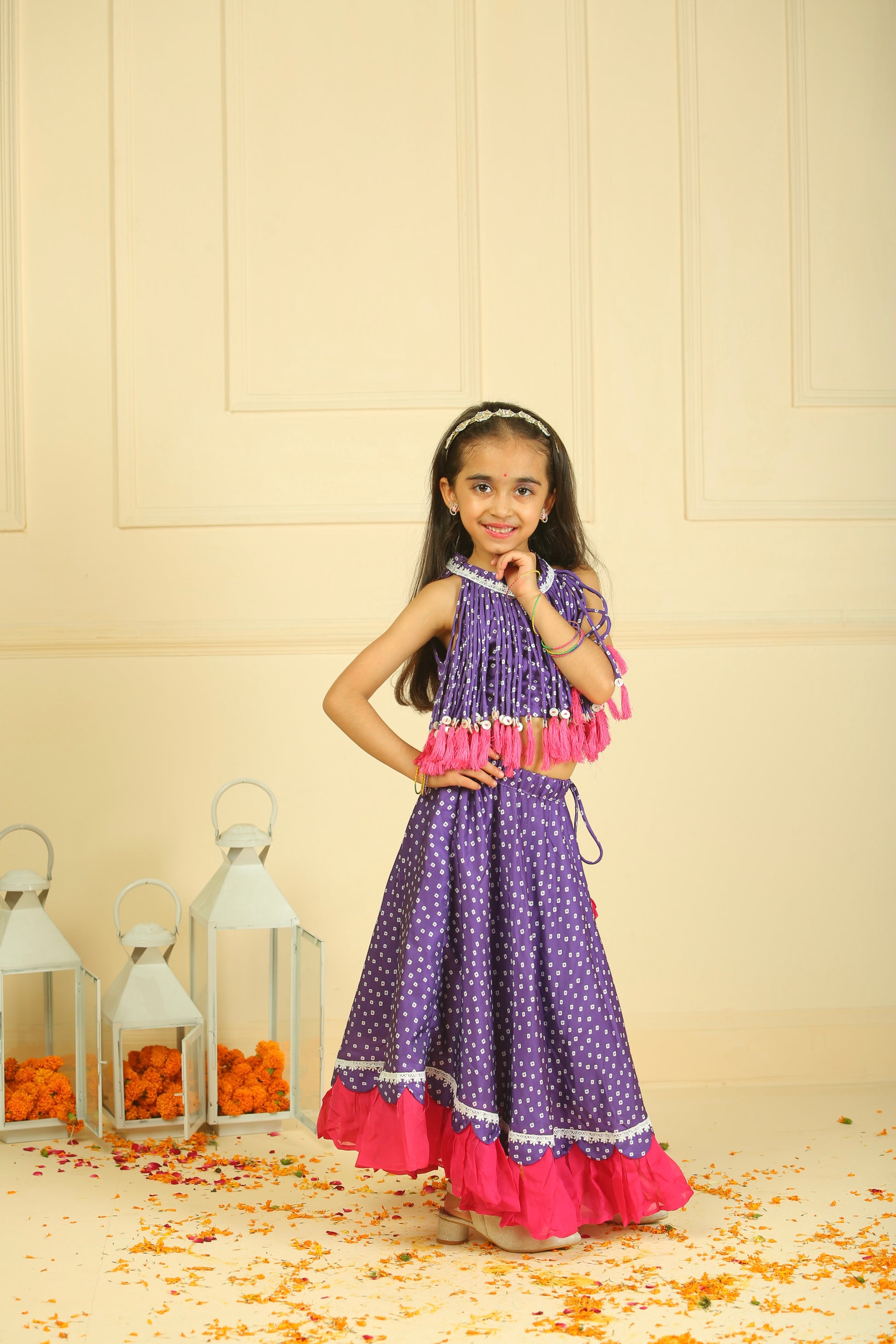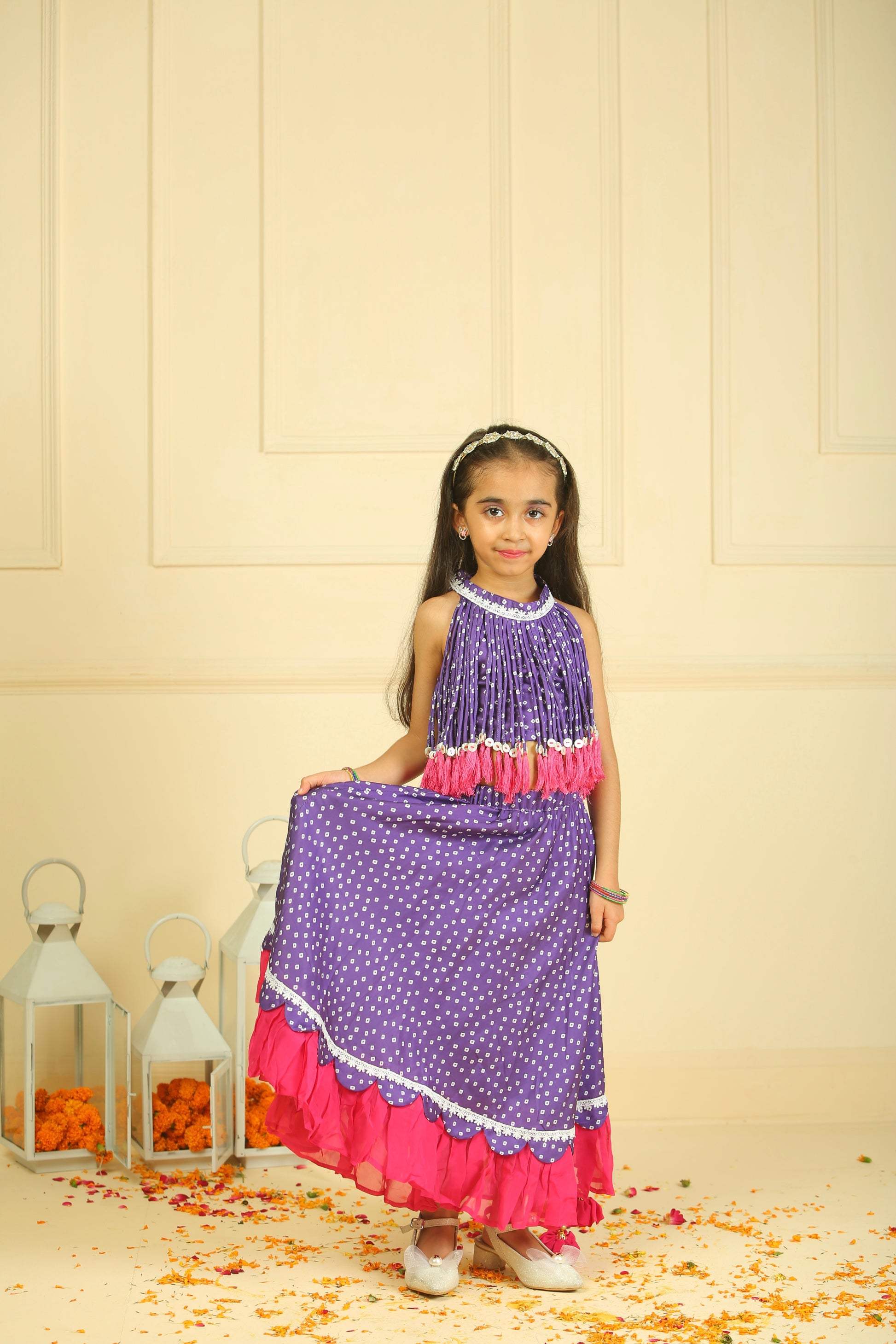 This vibrant purple bandhani halter top features delicate button accents and bright pink tassels, exuding festive charm. It pairs beautifully with a flared lehenga that showcases layered scallop and ruffle detailing at the hem, adding movement and elegance. Designed for celebration, this ensemble combines traditional craftsmanship with contemporary