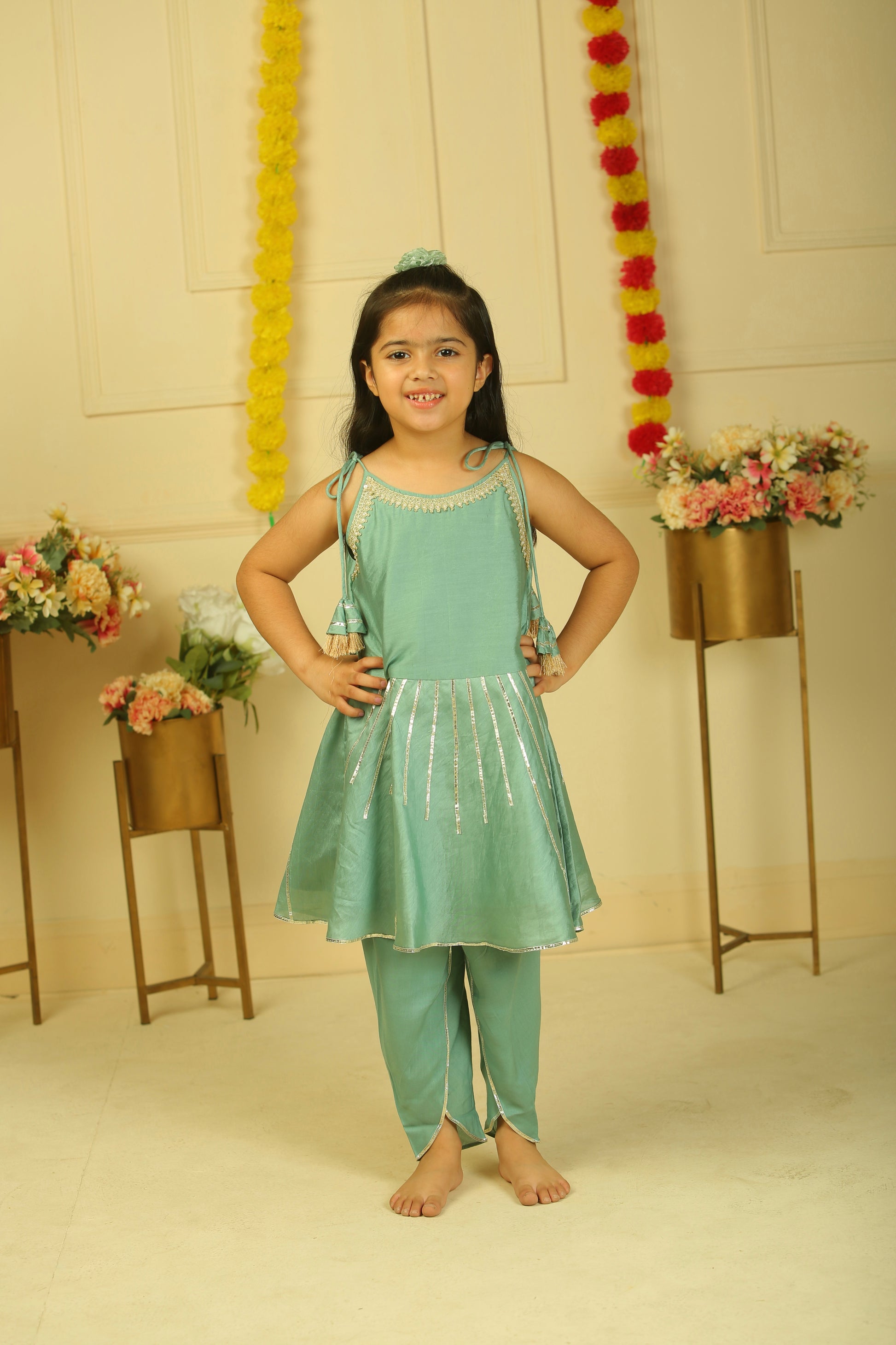 This elegant sage green dhoti set features adjustable tie-up tassel straps for a perfect fit and comfort. The golden lace neckline adds a refined touch, while silver lace stripes enhance the festive appeal. Designed with attention to detail, this ensemble combines traditional style with contemporary charm, making it an ideal choice for little girls on special occasions.