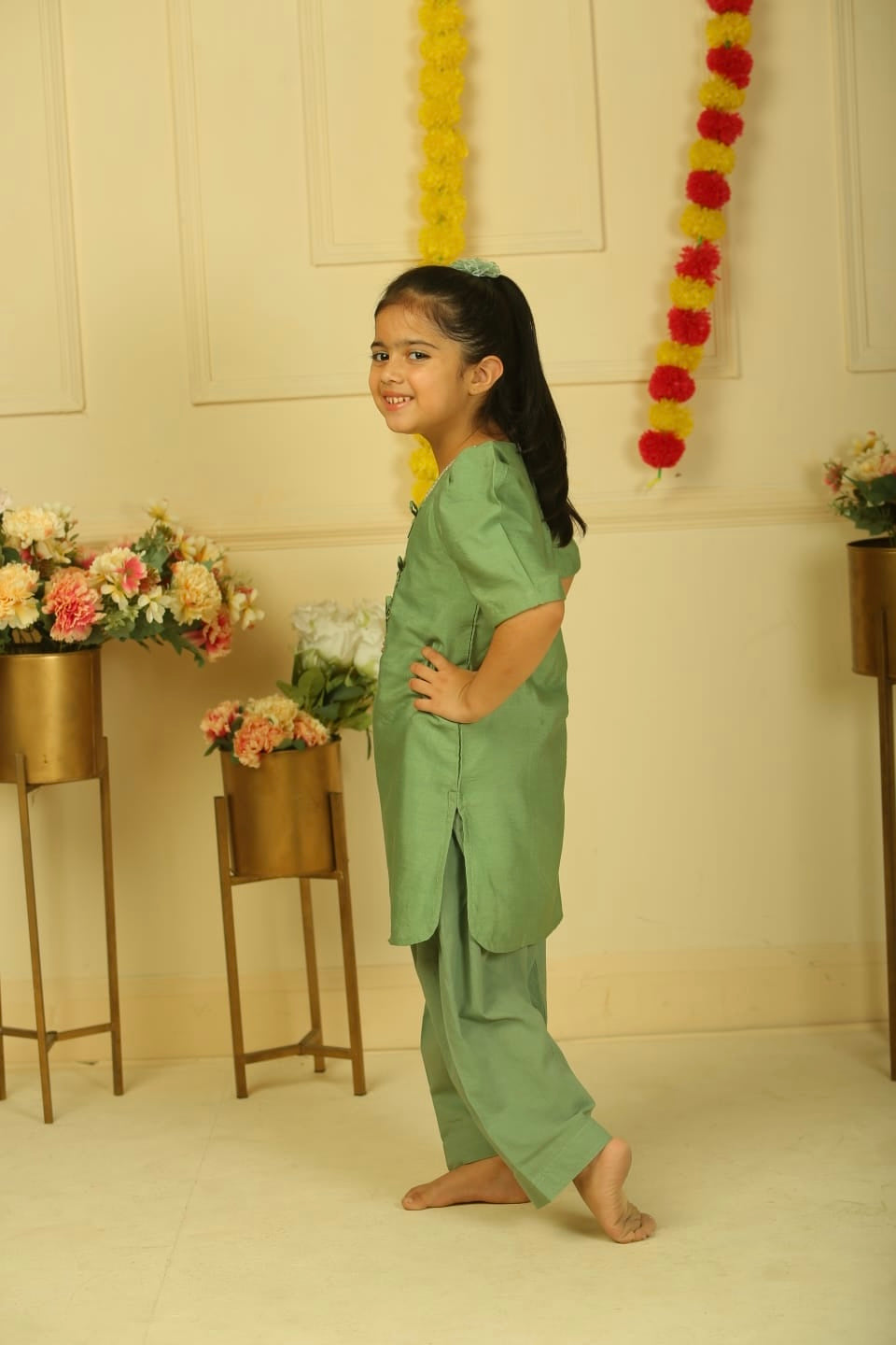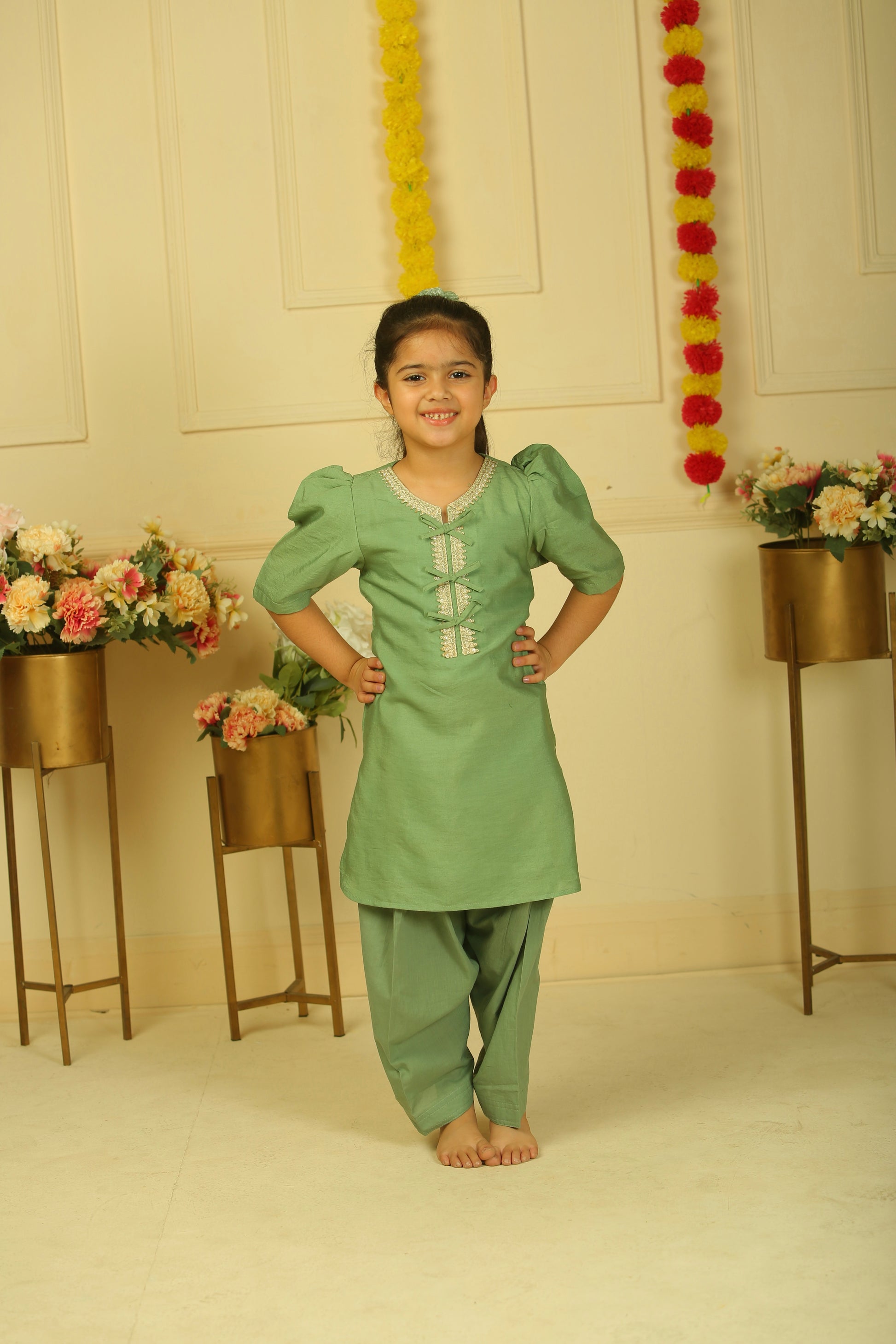 This elegant sage green kurta set for kids showcases intricate lace detailing and charming bow-tie accents on the neckline, enhancing its refined appeal. Paired with a matching salwar, it offers a harmonious balance of comfort and festive style, ideal for special occasions. Crafted thoughtfully, this ensemble ensures ease of movement while presenting a polished, sophisticated look for young wearers.
